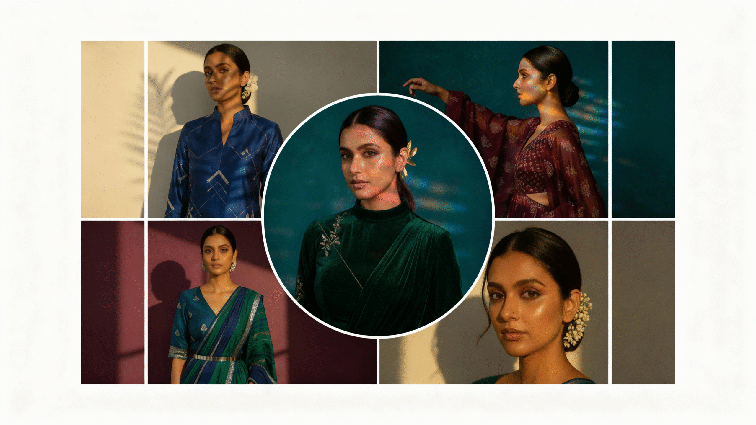 - “Traditional saree with gold border, minimal jewellery, retro cinematic film grain for timeless festive energy.”